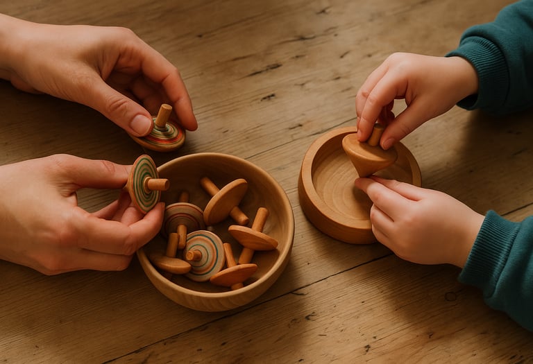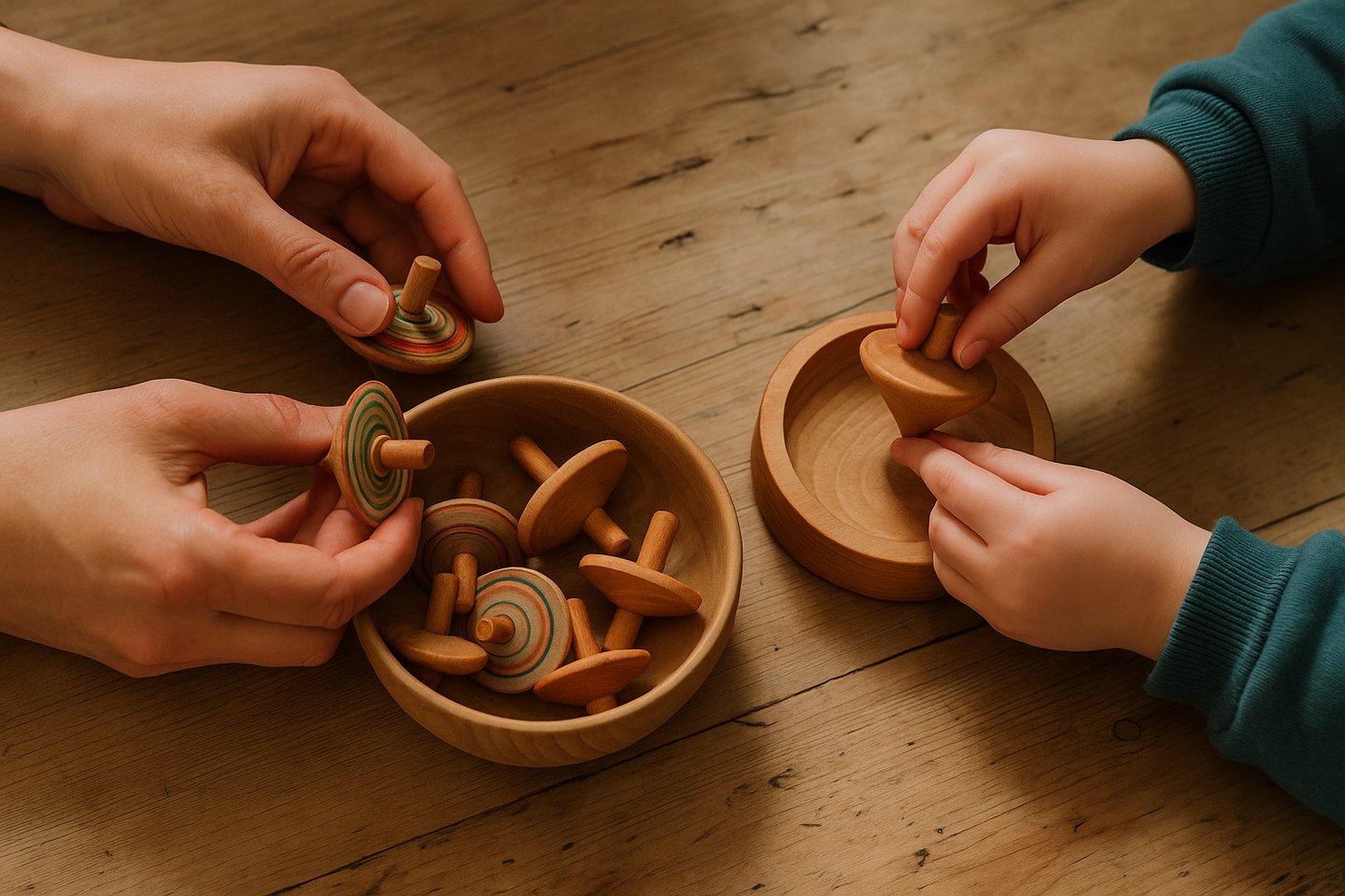 Our unique wooden holder doubles as a spinning toy, making it fun for kids to enjoy.